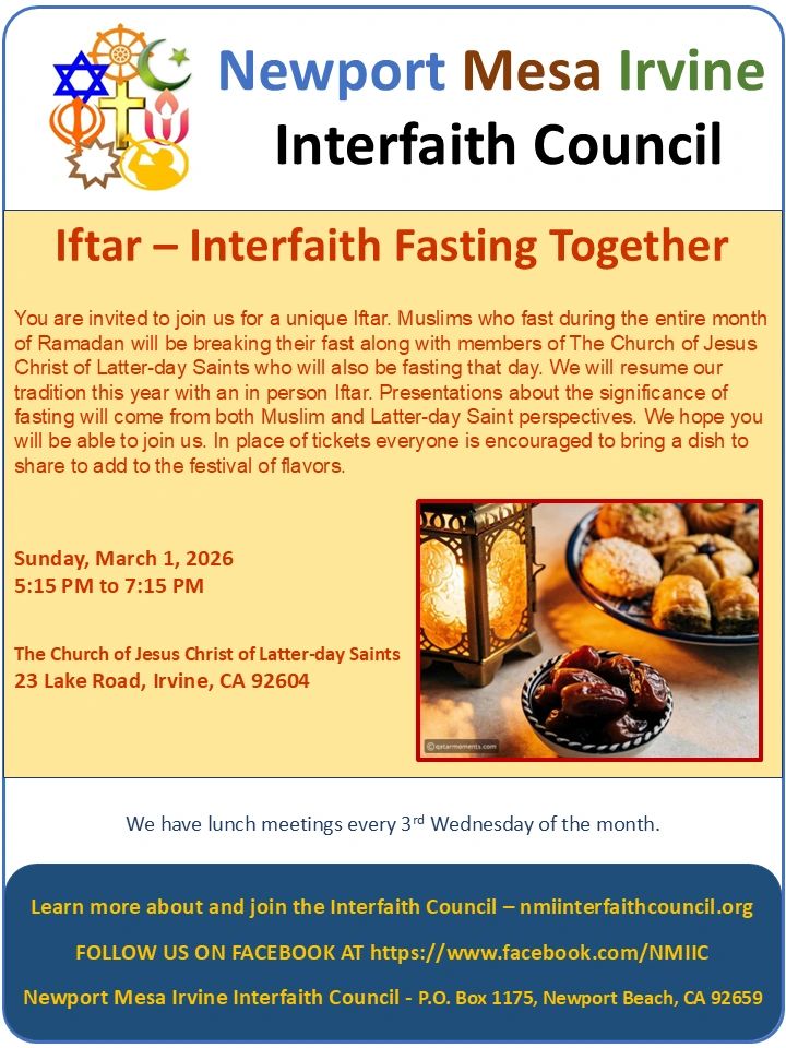 We invite you all to join with your friends and family to break the fast (even if you are not fasting) with your interfaith friends and family. We are resuming this popular Iftar hosted by the LDS congregation who also observe fasting on that day. Participate and enjoy a variety of dishes by bringing one to share with
